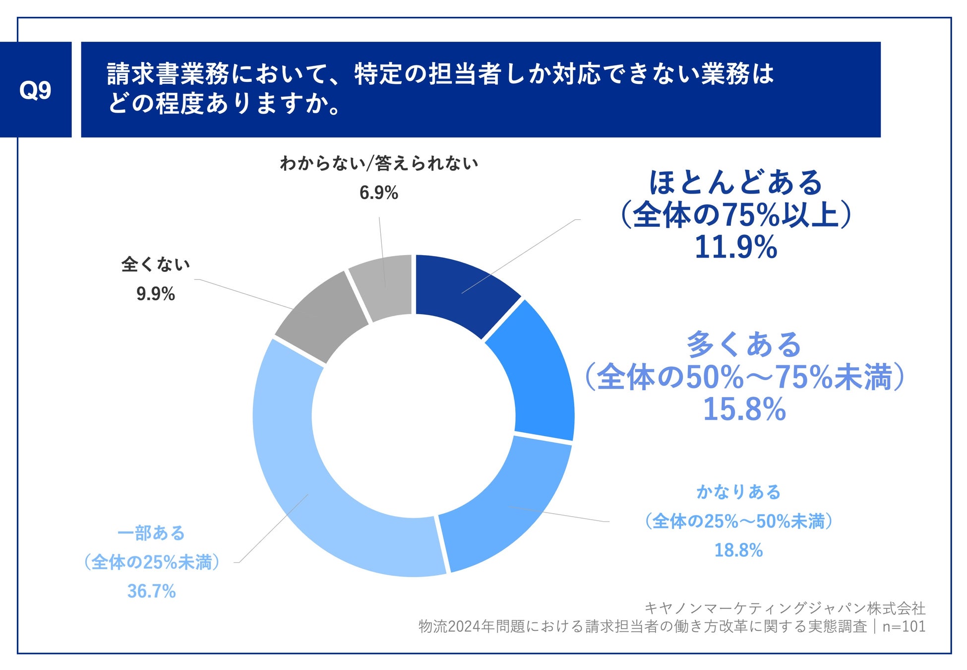 「Q9.請求書業務において、特定の担当者しか対応できない業務はどの程度ありますか。」と質問したところ、「一部ある(全体の25%未満)」が一番多く、36.7%の回答となりました。請求者業務において何かしら属人化した状態であると答えた人は全体の83.2%で、そのうち業務全体の50%以上が属人化していると回答した人は27.7%でした。