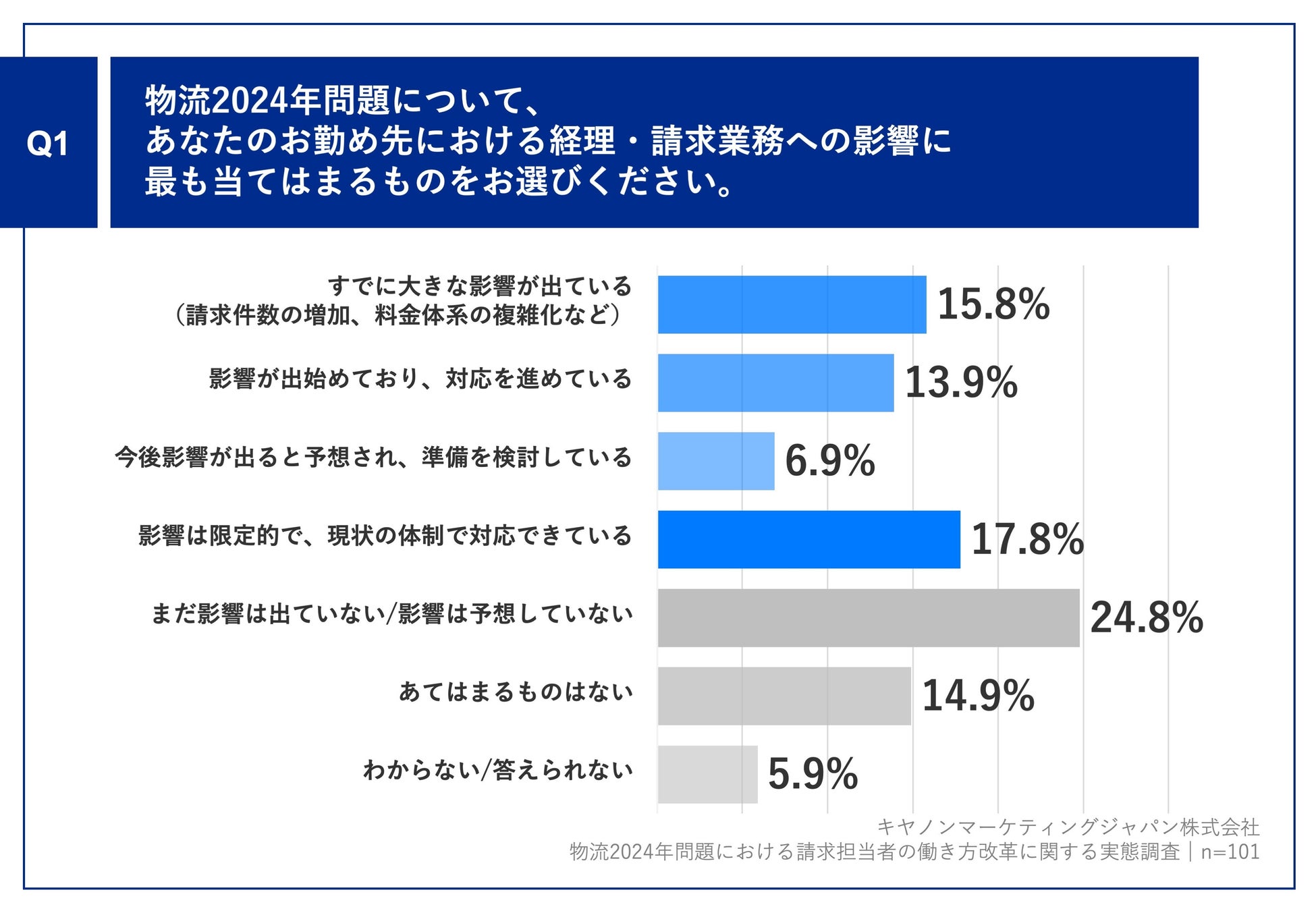 「Q1.物流2024年問題※1について、あなたのお勤め先における経理・請求業務への影響に最も当てはまるものをお選びください。」と質問したところ、「すでに大きな影響が出ている(請求件数の増加、料金体系の複雑化など)」が15.8%、「影響が出始めており、対応を進めている」が13.9%、「今後影響が出ると予想され、準備を検討している」が6.9%という回答となりました。