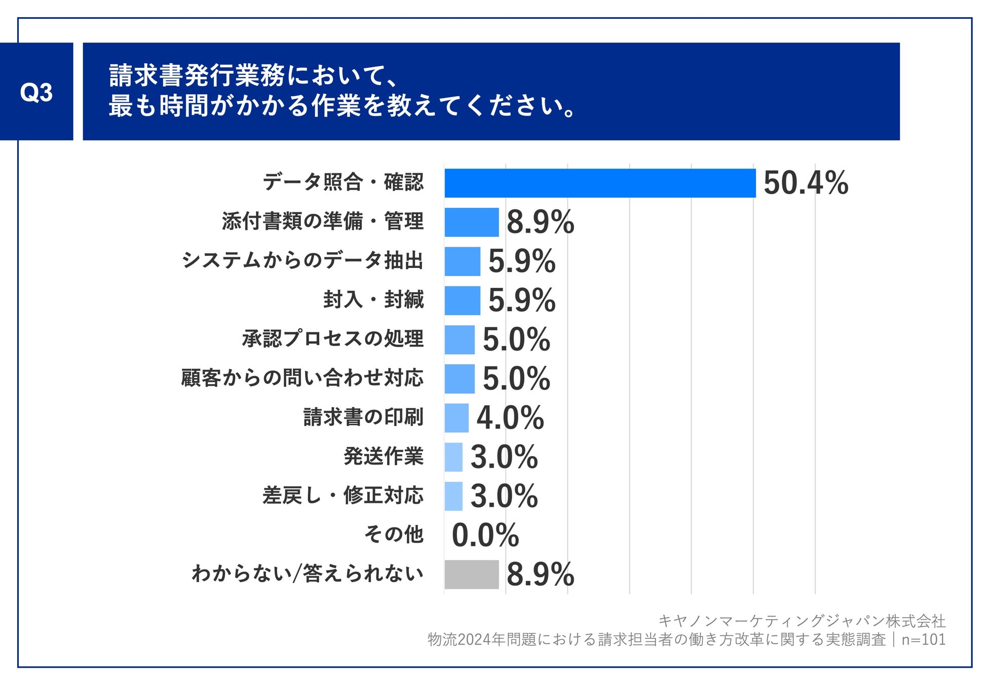「Q3.請求書発行業務において、最も時間がかかる作業を教えてください。」と質問したところ、「データ照合・確認」が50.4%、「添付書類の準備・管理」が8.9%という回答となりました。