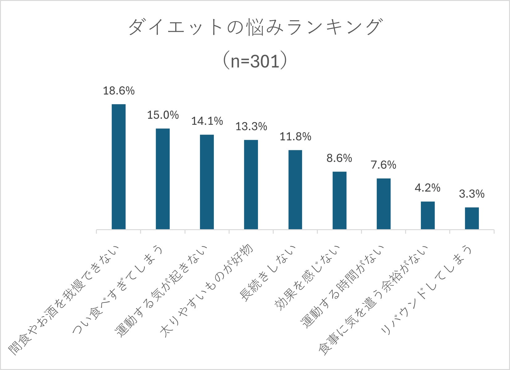 ダイエットに関する悩み1位は「間食やお酒を我慢できない」、2位に「つい食べすぎてしまう」が続きます。やせやすい食事に満足できずダイエットが長続きしないことに悩む人が多い様子。「運動をする気が起きない」は3位にランクイン。