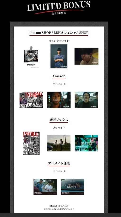 Amazon・楽天ブックス・アニメイト通販・mu-mo SHOP / LDHオフィシャルSHOPでは、商品購入者にオリジナル特典が先着付与される。今回はそのデザインも決定!店舗ごとに異なる特典は、ここでしか手に入らない!