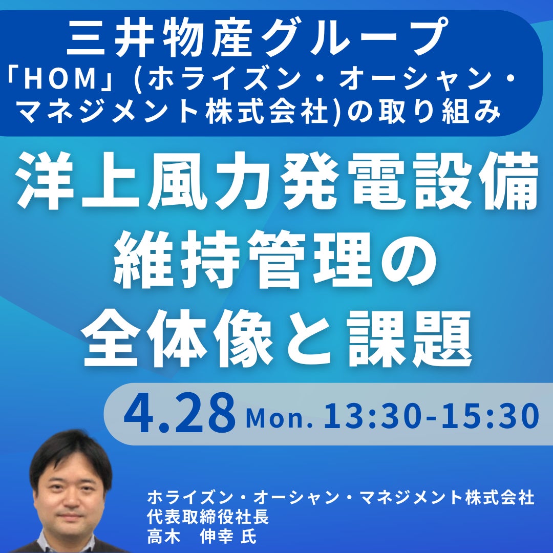 高木 伸幸 氏を招聘し、洋上風力発電設備の維持管理の全体像及び課題と三井物産グループ「HOM」(ホライズン・オーシャン・マネジメント株式会社)の取り組みについて詳説いただくセミナーを開催します。