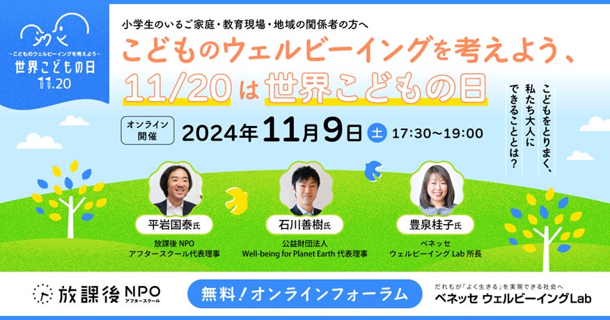 株式会社ベネッセホールディングス(本社:岡山県岡山市、代表取締役社長CEO:小林 仁、以下:ベネッセ)の「ベネッセウェルビーイングLab」(所長:豊泉桂子/ベネッセホールディングス 執行役員)は、11月9日(土)に、放課後NPOアフタースクールとの共催によるオンラインフォーラムを開催いたします。