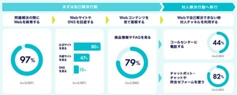 ● 消費者の97%はまずWeb検索を行い、79%は公式サイトの情報やFAQを駆使して自己解決をはかるが、