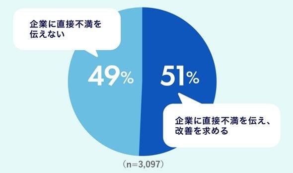 調査結果によると、企業に直接届く不満の声は全体の51%に過ぎず、残りの多くはSNSなどにクチコミの形で拡散し、それを見た他者の購買行動に影響を与えます。そのため、企業はSNS上の消費者の本音に耳を傾け、応えていくことが求められます。
