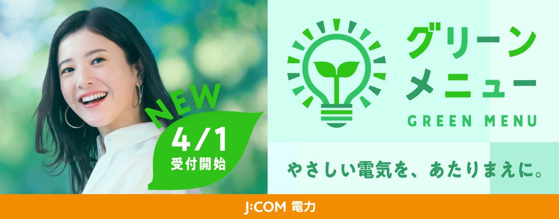 低圧電力小売りサービス「J:COM 電力 家庭用コース」において、環境にやさしい実質再生可能エネルギー100%の電気料金プラン「J:COM 電力 家庭用コース グリーンメニュー」(以下:「グリーンメニュー」)の提供を開始します。