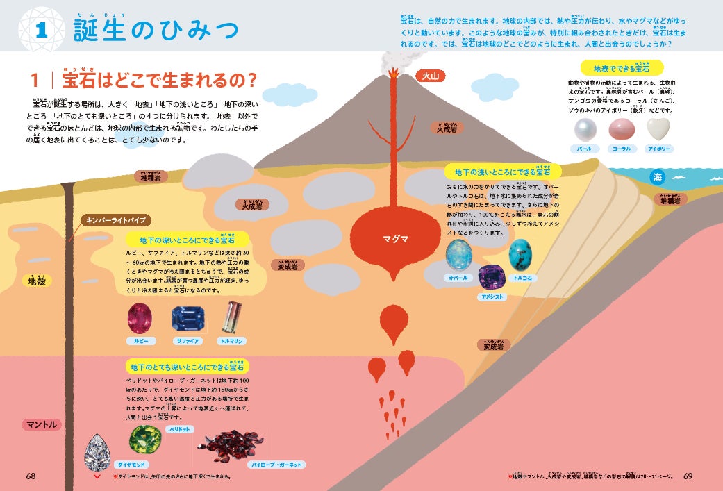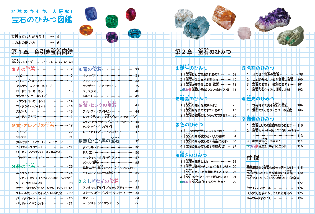 第2章では、まず初めに宝石がどこで生まれて、どうやって人間のもとにたどり着くかをわかりやすく図解します。さらに、結晶や輝きのひみつ、宝石にまつわる歴史的エピソードまで、宝石をあらゆる角度から徹底解剖! 地球科学から物理、歴史文化に至るまで、目からウロコのおもしろトピックが満載です。巻末には、元素周期表などの科学資料も掲載。