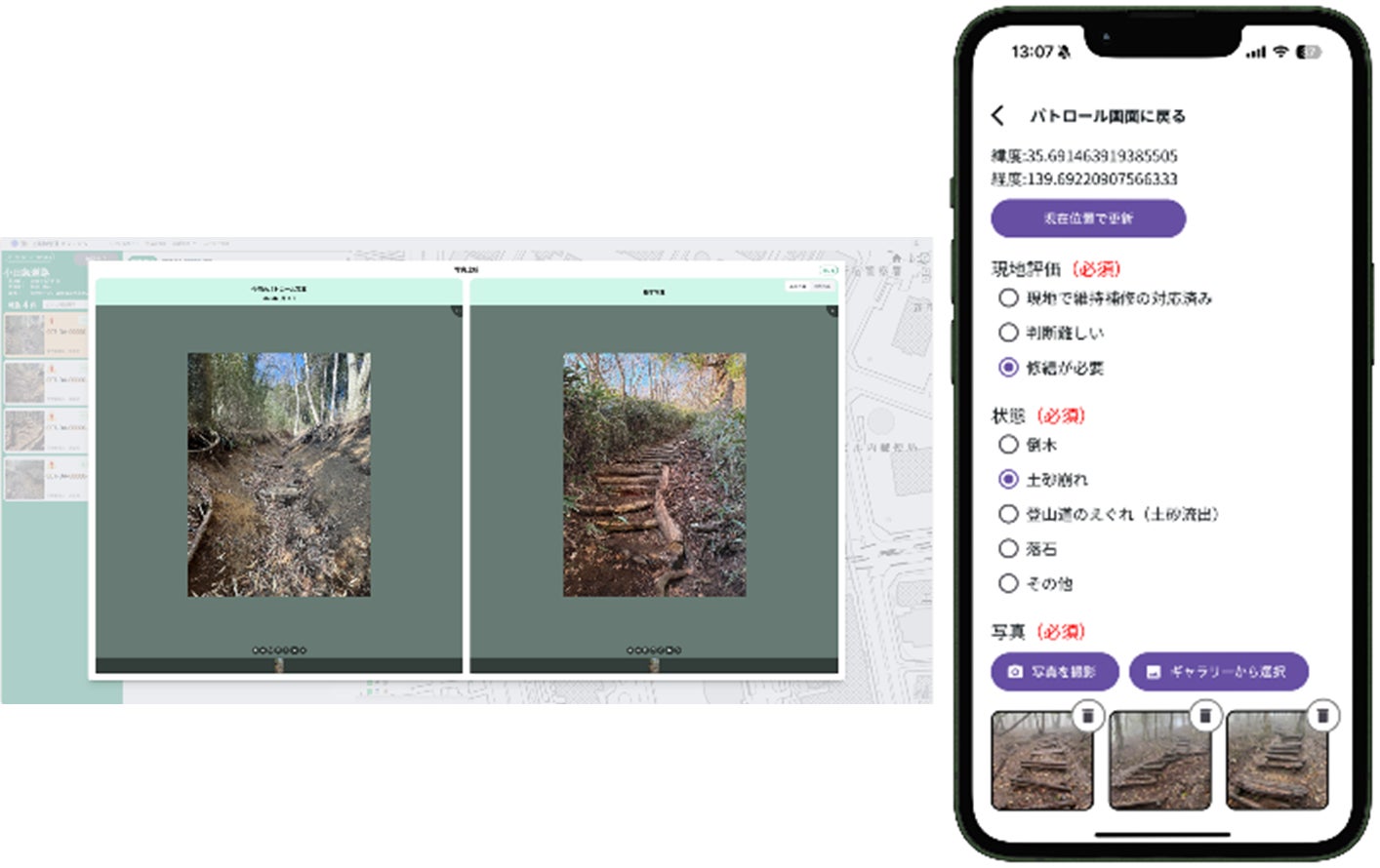登山道維持管理DXシステムの「情報収集・整理」機能は、点検時にスマートフォンで撮影した損傷箇所の画像とデータ(日時・場所)、さらに撮影者による緊急性判断コメントを、システムへ事前にインプットした台帳に自動で紐づけます。これにより、修繕実施の判断が迅速化するとともに、システムを通じて作業者間で正確な情報共有が可能となり、再点検が不要になります。