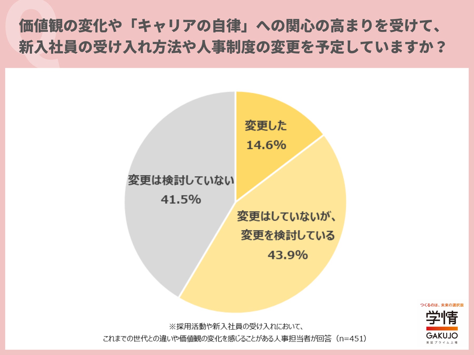 価値観の変化や「キャリアの自律」への関心の高まりを受けて、新入社員の受け入れ方法や人事制度を「変更した」と回答した企業は14.6%でした。「変更はしていないが、変更を検討している」43.9%を合わせると、約6割の企業が「キャリアの自律」への関心の高まりを受け、受け入れ方法や人事制度を変更した、または変更を予定していることが分かります。