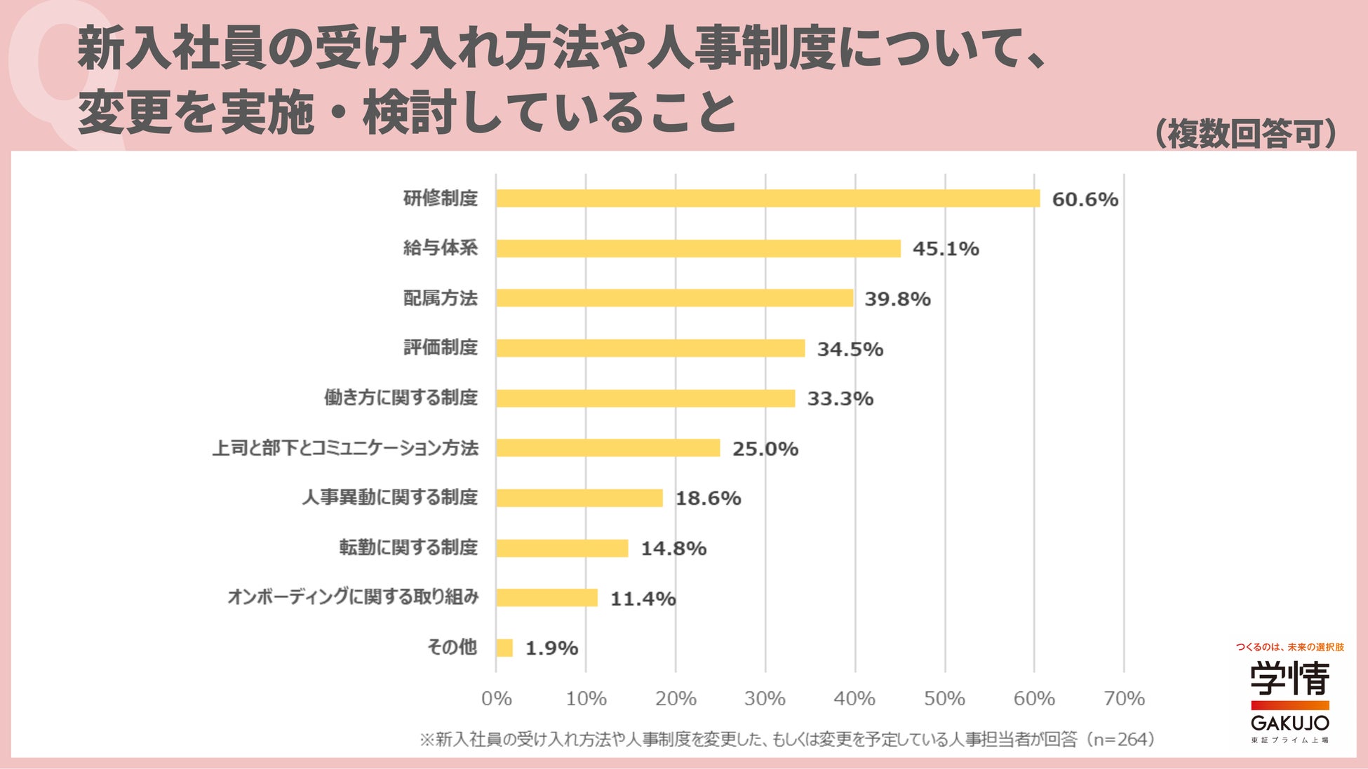 新入社員の受け入れ方法や人事制度について、変更を実施・検討していることは「研修制度」が60.6%で最多。次いで、「給与体系」45.1%、「配属方法」39.8%が続きました。