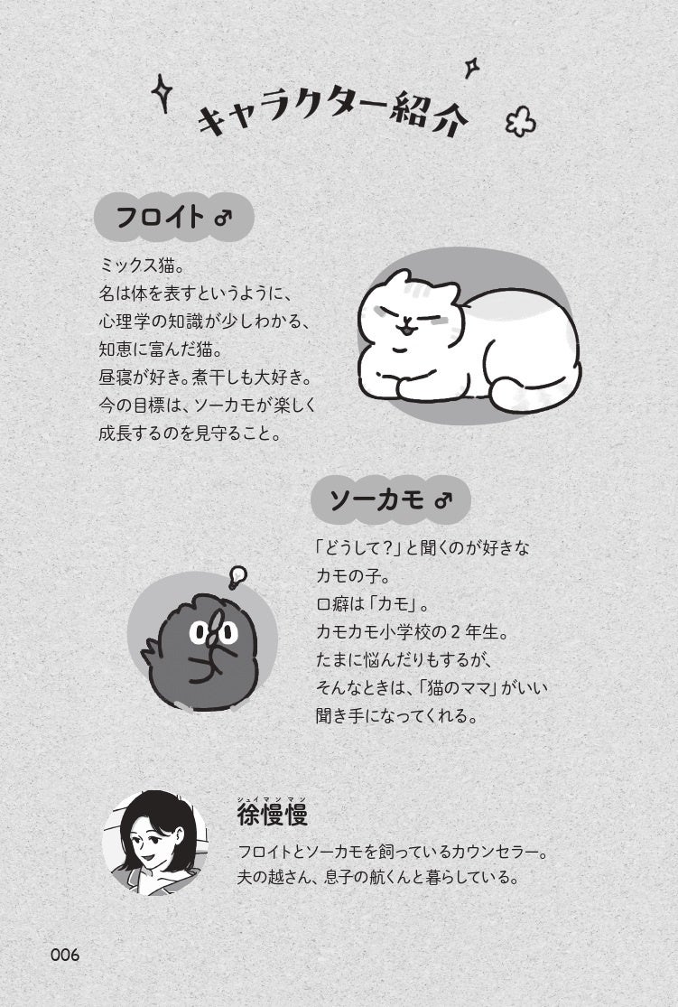 本書には心理学の知識が少しわかる、知恵に富んだ猫・フロイトと「どうして?」と聞くのが好きなカモの子・ソーカモが登場します。
