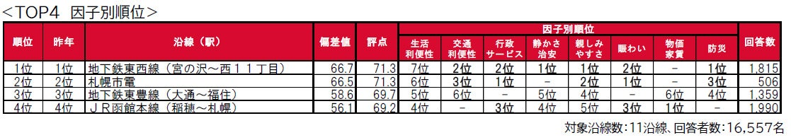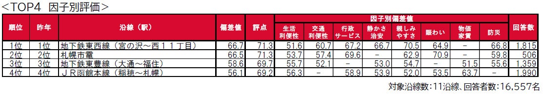 街の住みここち沿線ランキング2024<札幌都市圏版> TOP4の因子別評価&順位