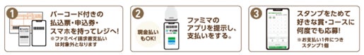 キャンペーン期間中にファミリーマート店頭でファミマのアプリをスキャンした上で公共料金・税金・通販代金などをお支払いいただきます。お支払い1件につきファミマのアプリにスタンプを1個進呈いたします。必要数に応じたスタンプを交換いただくことで各特典にご応募いただけます。