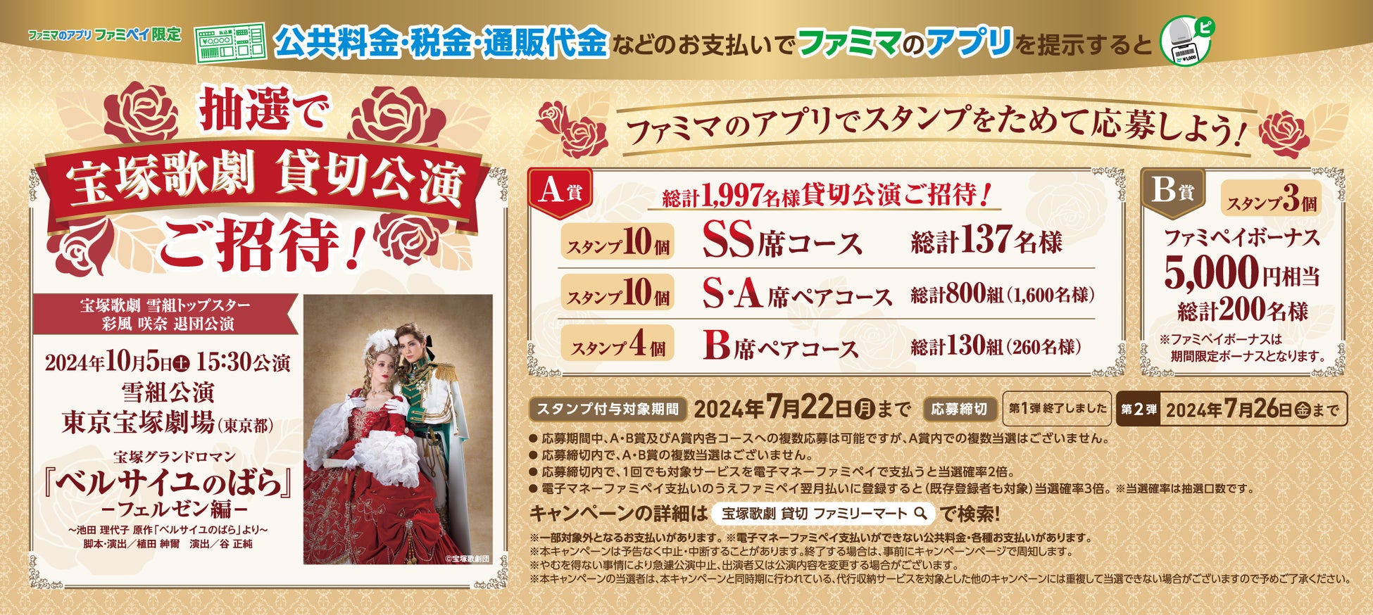 公共料金・税金・通販代金などのお支払いでファミマのアプリを提示すると抽選で「宝塚歌劇貸切公演(宝塚歌劇団雪組トップスター彩風咲奈さん退団公演)」ご招待キャンペーン第2弾を6月11日(火)よりスタート!