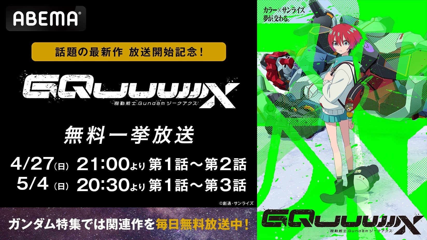 新しい未来のテレビ「ABEMA」は、ゴールデンウィークに合わせ2025年4月27日(日)より、『機動戦士Gundam GQuuuuuuX(ジークアクス)』最新話まで全話を無料振り返り一挙放送いたします。