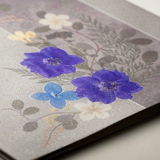 静謐(せいひつ)なグレーを基調とした和風の台紙に、優美な印象の紫と青のおし花をあしらいました。