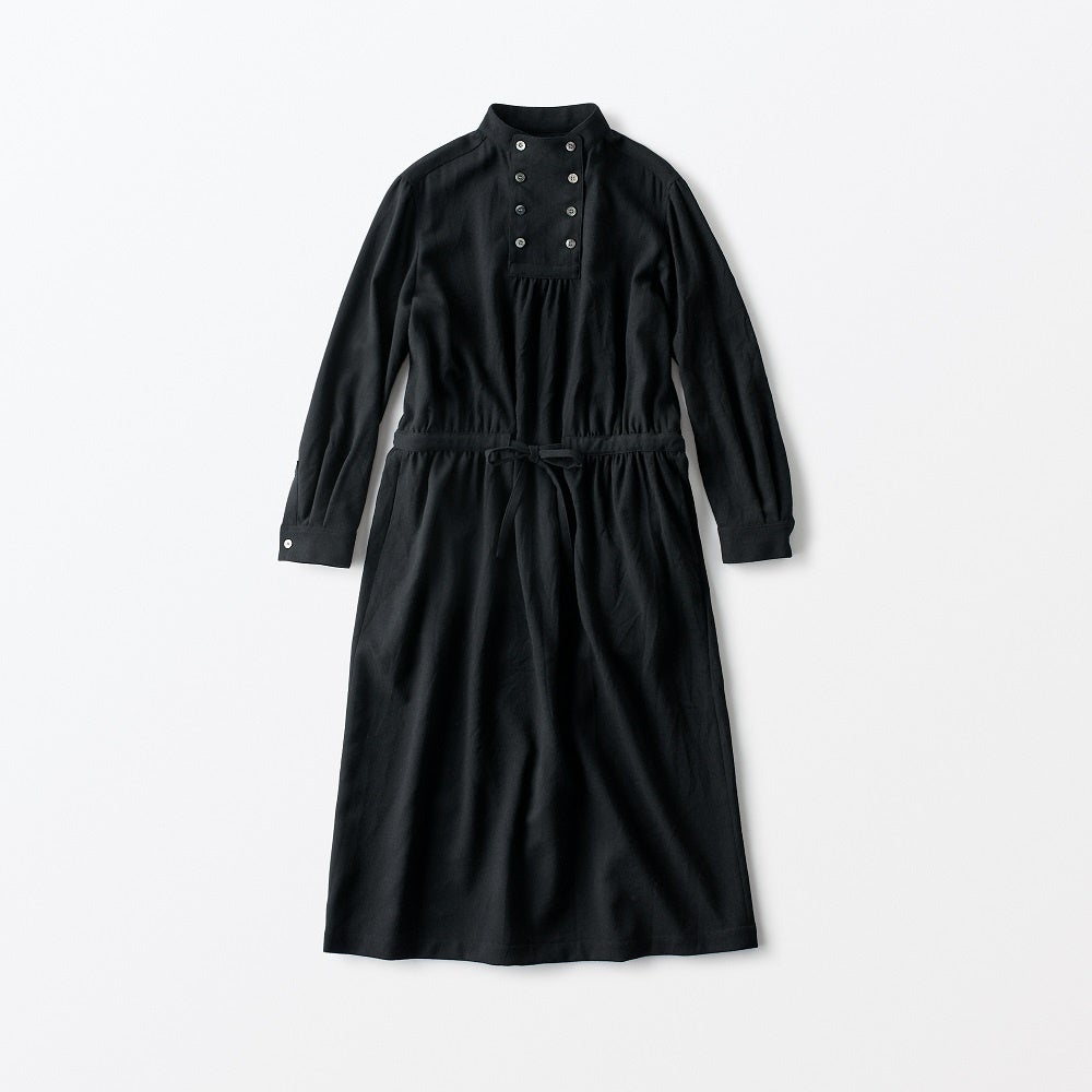 胸元の8つのボタンが印象的なワンピース。ウエストにあしらったギャザーが可憐な雰囲気を演出します。愛知県の機屋倉庫で残反として余っていた生地を使用しました。
