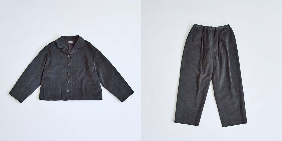 静岡県内の機屋さんの倉庫で生機の状態で使われず眠っていた反物に、染色を施したコーデュロイジャケットとパンツ。温かみのあるコーデュロイ生地で、ジャケットはフロントに5つ並んだボタンがポイント。丸みのある襟やポケットがほどよいカジュアルな印象です。セットアップのコーディネートはオケージョンにもおすすめです。ユニセックスで着用いただける仕様です。