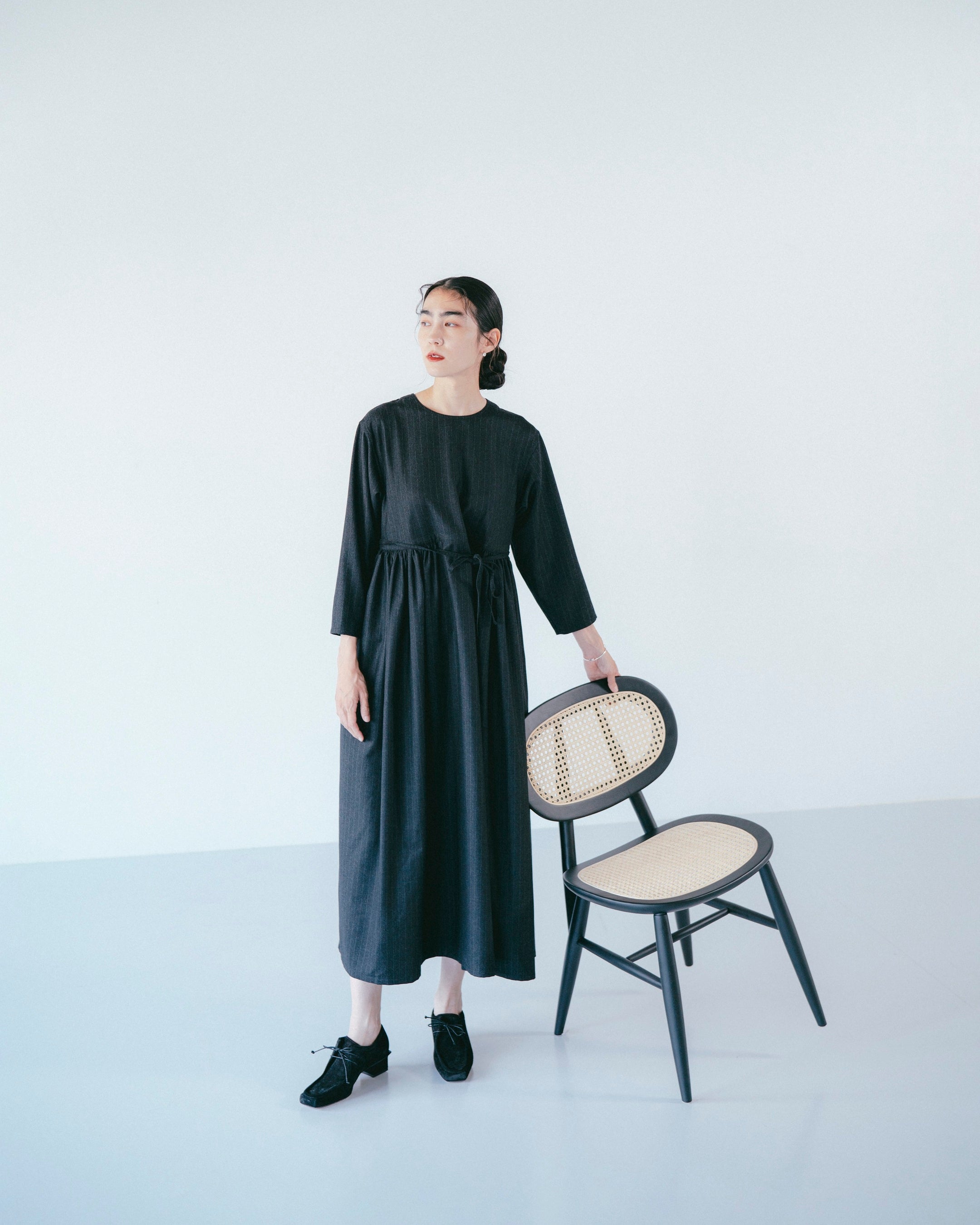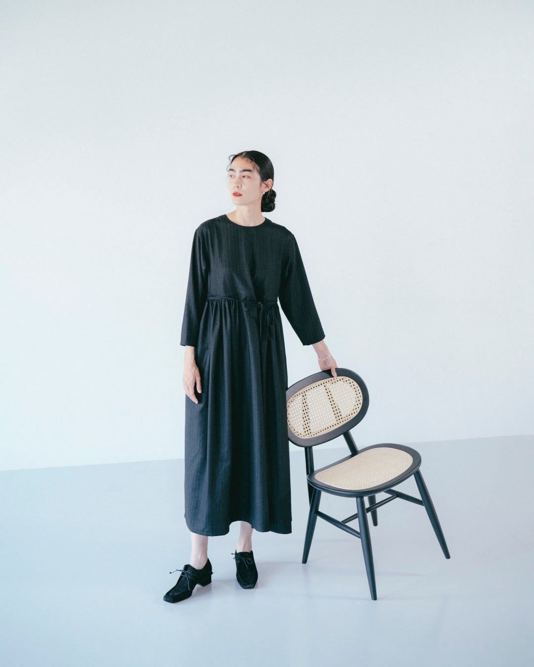 どことなくクラシカルな雰囲気を帯びているギャザーワンピース。ウエストから広がるギャザーが印象的です。たっぷりと使った生地、そして細やかなギャザーが織りなすシルエットが美しく風に揺らぎます。愛知県の機屋倉庫で残反として余っていた生地を使用しました。