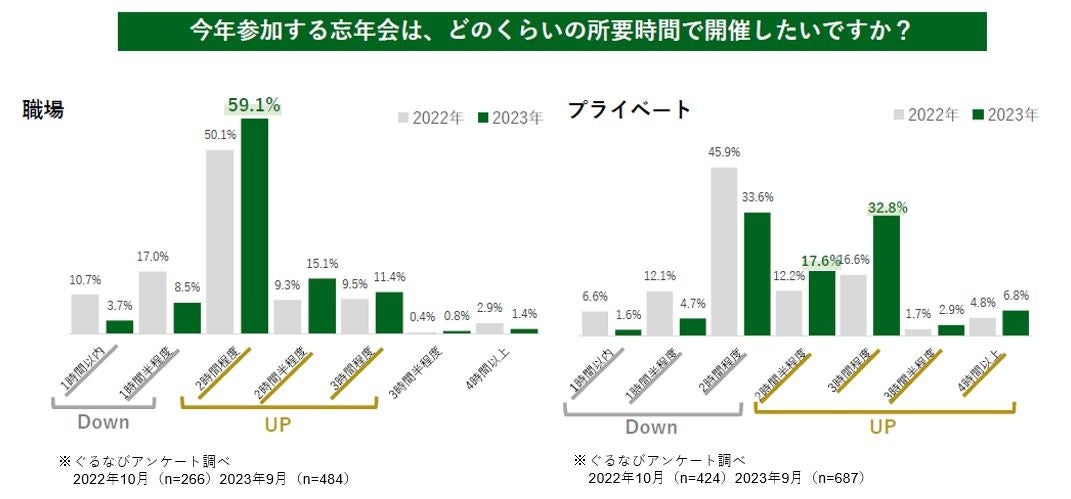 ぐるなび会員を対象に、今年の忘年会の所要時間について尋ねると、今年の忘年会は昨年と比較して2時間以内の開催となる短時間宴会が減少傾向となり、長時間での開催需要が高まっている結果となりました。職場では2時間程度、プライベートでは2~3時間程度の要望が多くなっています。