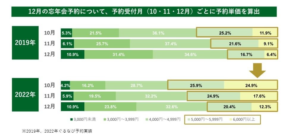 コロナ前の2019年と2022年のぐるなびネット予約実績をもとに12月に開催する忘年会予約について、受付月ごとに予算単価を算出したところ、昨年は5000円以上の予算の割合が増加。また、10月に受け付けた12月の忘年会予約は高単価の割合が高いため、早期の販促開始により高単価のコース予約獲得を狙えることがうかがえます。