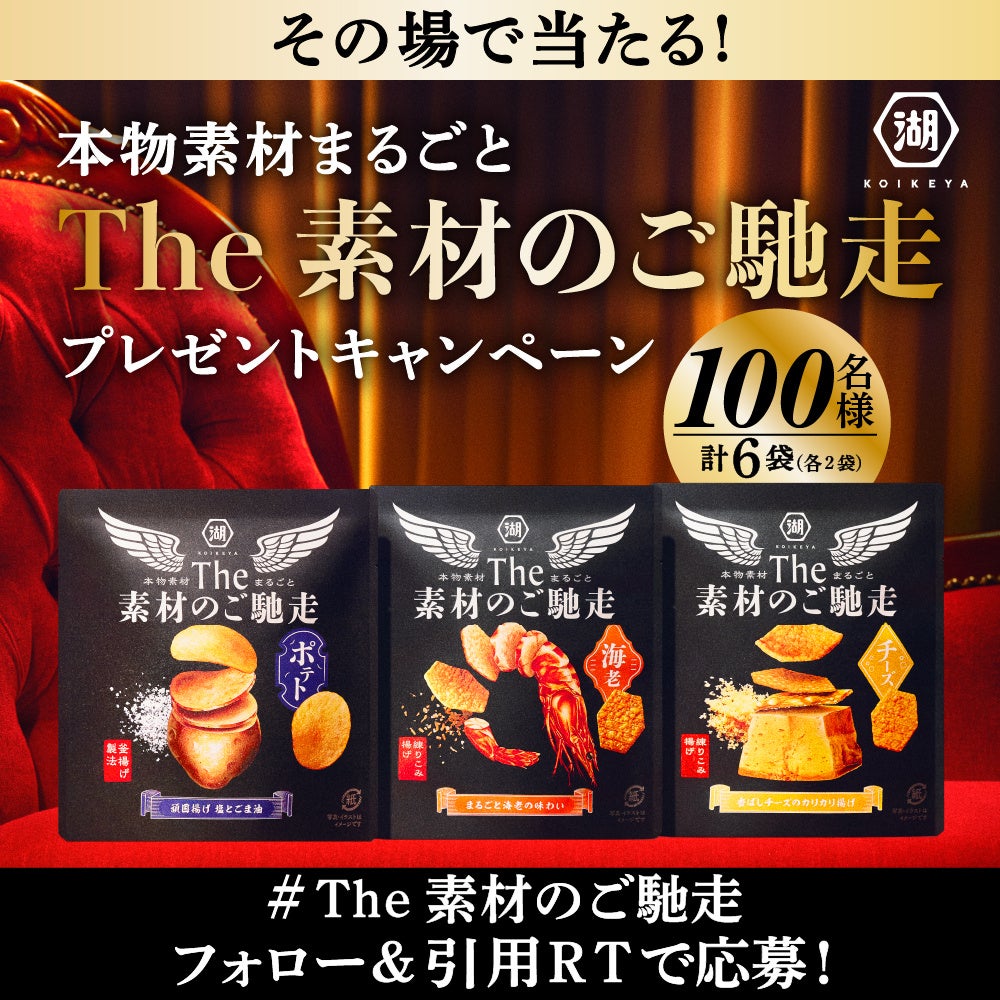 フルラインナップの発売を記念するとともに、「The 素材のご馳走」シリーズをより多くのみなさまに知っていただき、お試しいただきたいとの思いから、「The素材のご馳走」3品各2袋(計6袋)がその場で100名様に当たるTwitterキャンペーンを実施します。みなさまぜひご応募ください。