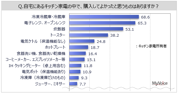 【キッチン家電に関する調査】購入してよかったキッチン家電は、「冷凍冷蔵庫・冷蔵庫」「電子レンジ、オーブンレンジ」がキッチン家電所有者の各60%台、「炊飯器」が5割強