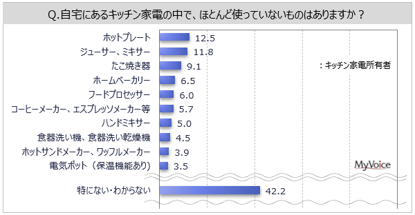 ■購入してよかったキッチン家電は、「冷凍冷蔵庫・冷蔵庫」「電子レンジ、オーブンレンジ」がキッチン家電所有者の各60%台、「炊飯器」が5割強。ほとんど使っていないキッチン家電がある人は、キッチン家電所有者の5割強。「ホットプレート」「ジューサー・ミキサー」が各1割強、「たこ焼き器」が約9%