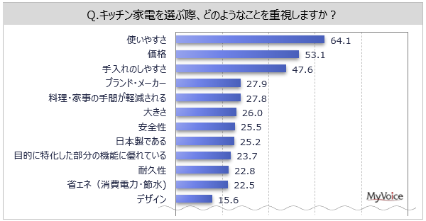 ■キッチン家電選定時の重視点は「使いやすさ」が6割強、「価格」「手入れのしやすさ」が5割前後、「ブランド・メーカー」「料理・家事の手間が軽減される」が各3割弱