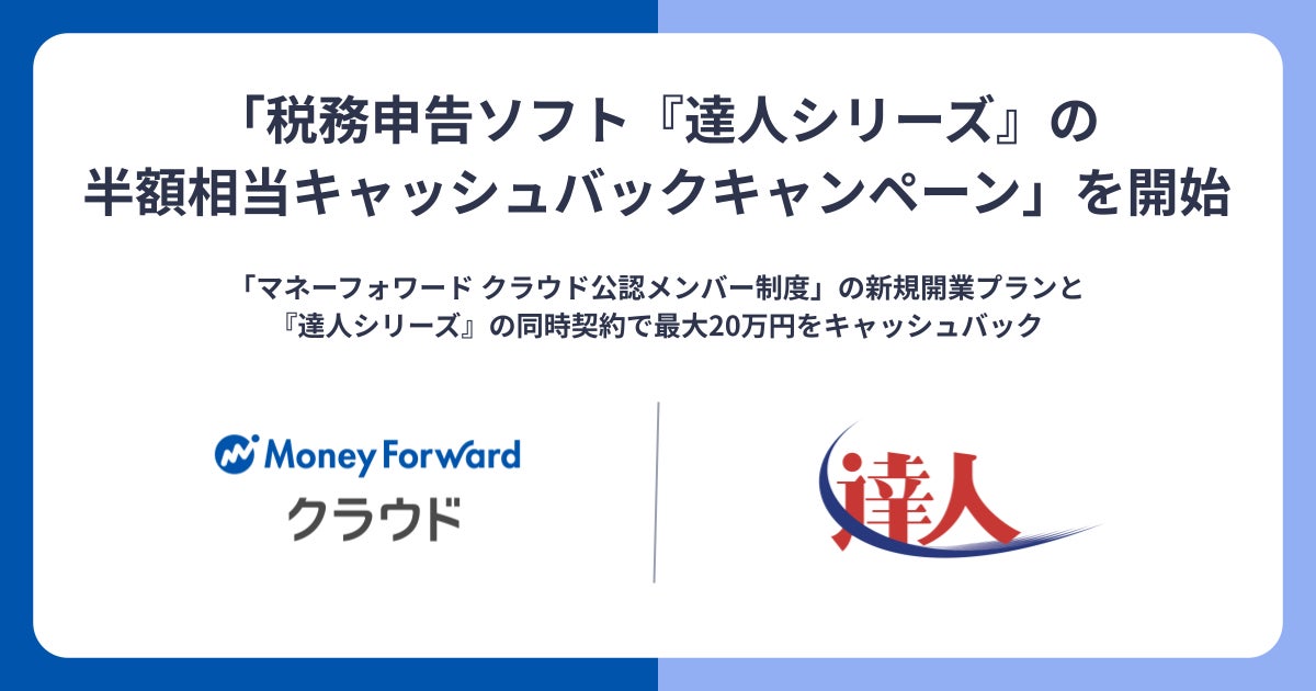 株式会社マネーフォワードは、「マネーフォワード クラウド公認メンバー制度」の新規開業プランをご契約いただいた士業事務所を対象に、「税務申告ソフト『達人シリーズ』半額相当キャッシュバックキャンペーン」を開始します。本キャンペーンは、2024年9月1日 〜 2025年8月31日の期間、税務申告ソフト『達人シリーズ』を同時にご導入いただいた士業事務所に対し、『達人シリーズ』の利用料金の半額相当に当たる金額の最大20万円をキャッシュバックするキャンペーンです。