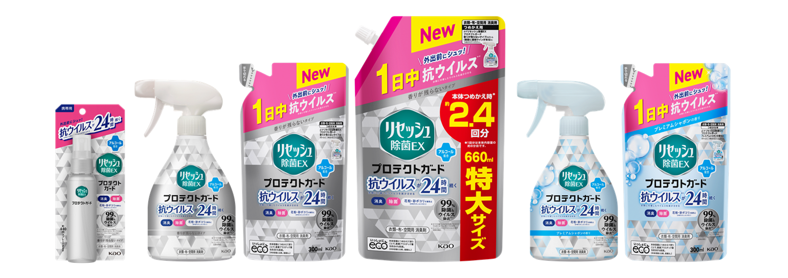 「リセッシュ除菌EX」シリーズ共通の消臭・防臭機能や除菌※1・ウイルス除去※1※2機能に加えて、「リセッシュ除菌EX プロテクトガード」は、抗ウイルス(衣類に付着したウイルスを減少させる)※1※2効果が24時間持続します。また、静電気防止成分配合により、この季節、特に気になる花粉や砂ボコリ・ハウスダストなど微粒子の付着も抑制します。外出やお仕事前にスプレーするだけで、1日中衣類を清潔に保つ「手軽に続けられる衛生対策」を提案してまいります。