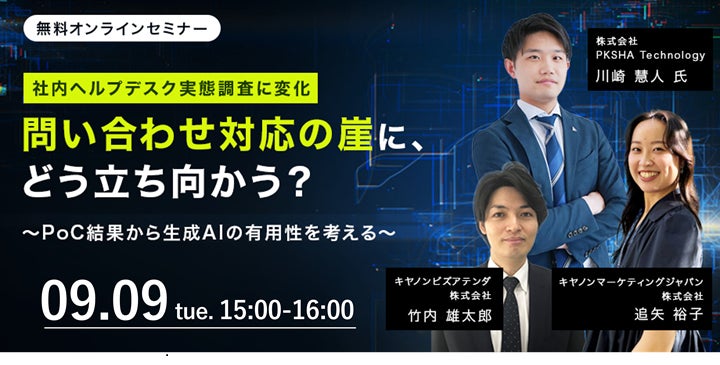 キヤノンマーケティングジャパン株式会社(代表取締役社長:足立正親、以下キヤノンMJ)は、無料オンラインセミナー「社内ヘルプデスク実態調査に変化 問い合わせ対応の崖に、どう立ち向かう?~PoC結果から生成AIの有用性を考える~」を、2025年9月9日(火)に開催します。本セミナーでは、社内ヘルプデスク業務における実態調査の結果と、煩雑化する問い合わせ対応への解決のヒントを紹介します。
