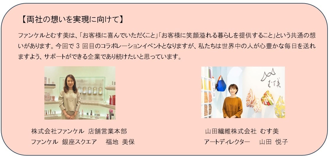 当社も「FANCL リサイクルプログラム」として、使用済みの化粧品容器を回収してアップサイクルする活動に力を入れています。今回の特別ディスプレイ・コラボレーションイベントは、当社と「むす美」のサステナブルな循環型社会を目指す想いが合致して実現しました。
