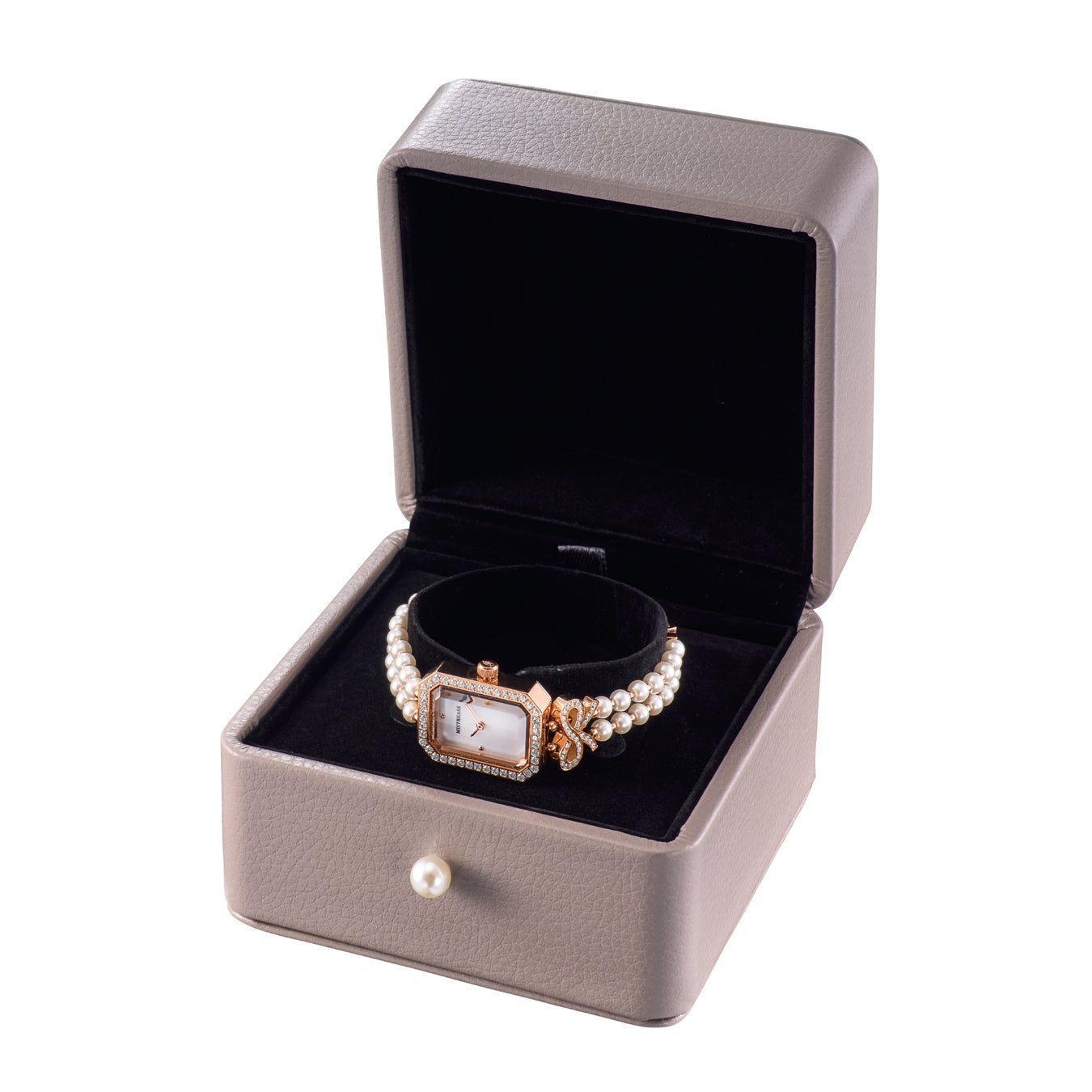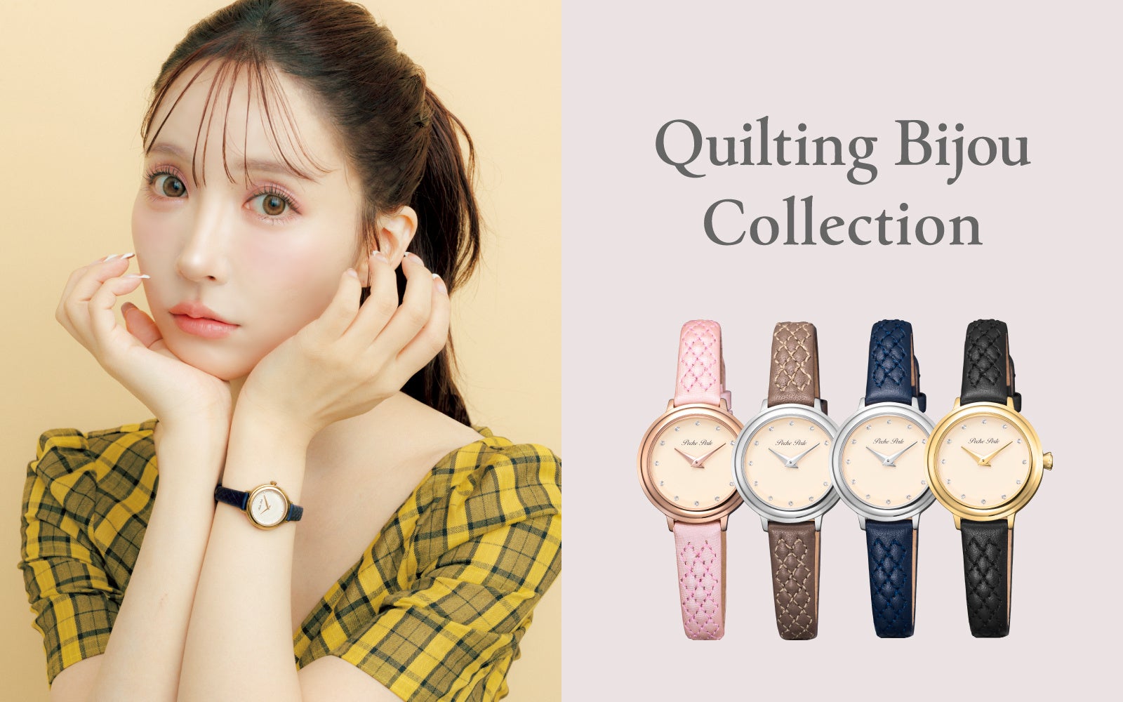 PechePerleのオリジナルウォッチ。キルティングのようなステッチを施したベルトに12石のクリスタルが輝く文字盤を合わせた気品漂う1本です。