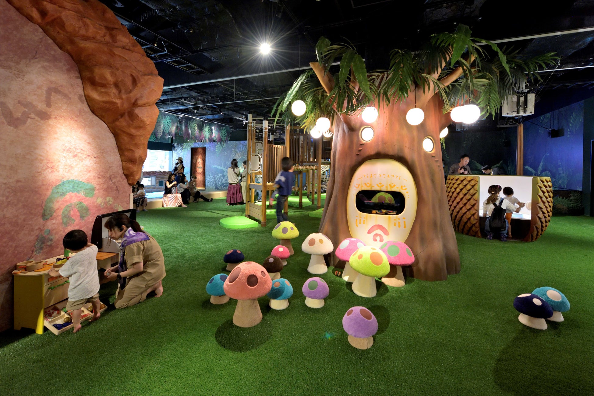 デジタル技術とアナログな遊びの組み合わせにより、激流を滑ったり、雲の上で飛び回ったり、不思議な妖精と出会ってお友だちになる、そんな子どもたちの空想を具現化したような夢いっぱいの冒険遊びができるデジタルプレイグラウンドです。2018年の開業以来、たくさんのお子さまがドコドコ島で物語の主人公となって冒険あそびを楽しみ、この島に住むきのこの妖精「きのこのこ」とお友だちになりました。保護者の方からも、「大人でもわくわくする」、「屋内にいながら安全に、汚れずに、思いっきり冒険遊びを楽しめる」と好評をいただいています。