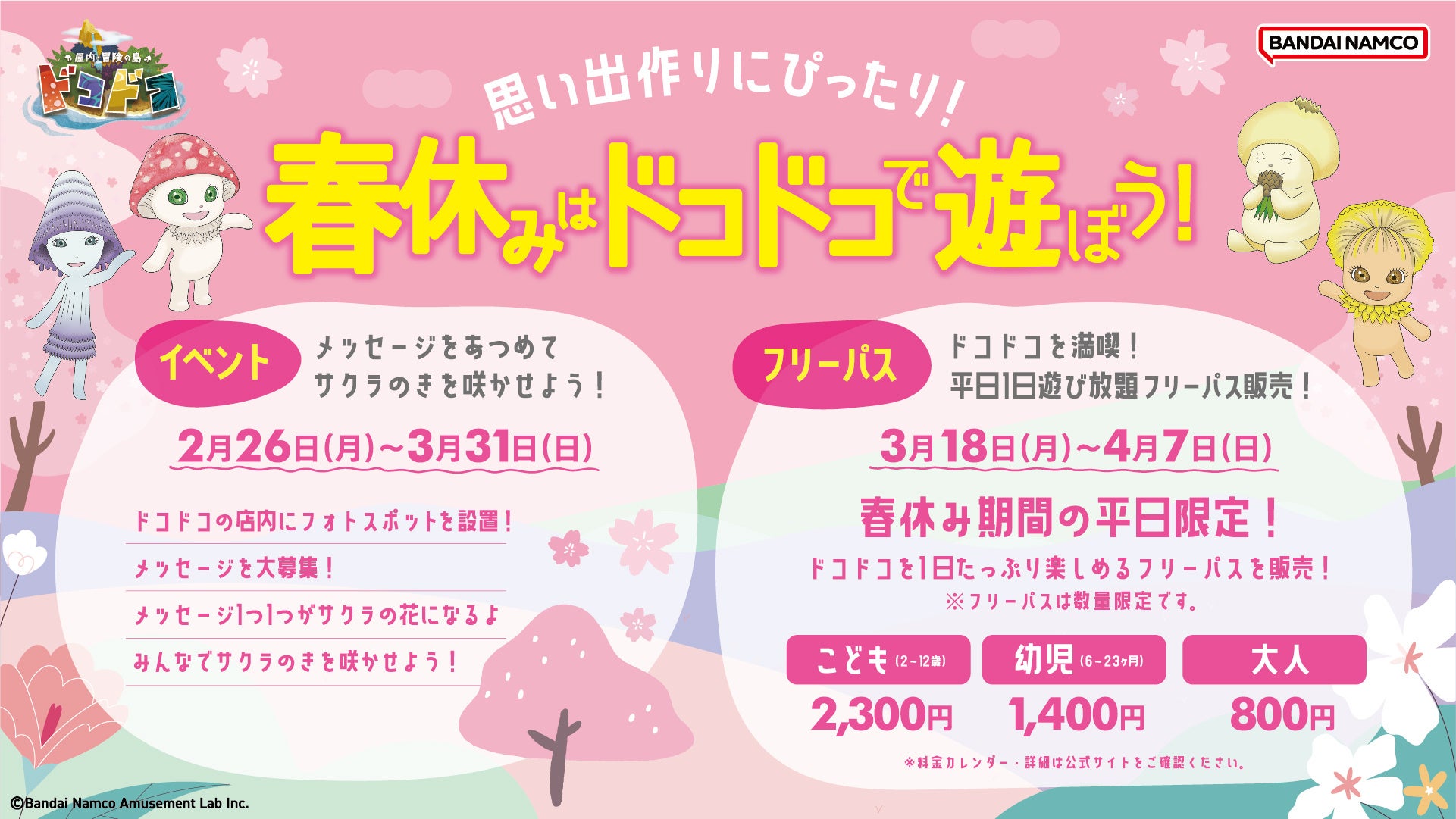 株式会社バンダイナムコアミューズメントは、『屋内・冒険の島 ドコドコ』(東京都立川市)で春休みの思い出作りにぴったりのイベントを2024年2月26日(月)~3月31日(日)に開催します。