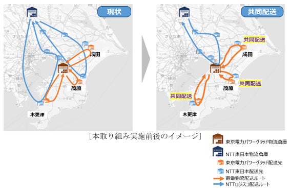 本取り組みにおける輸配送業務については、NTT東日本の輸配送を株式会社NTTロジスコ、東京電力PGの輸配送を東電物流株式会社にそれぞれ委託し、両社が連携して共同配送を実施します。