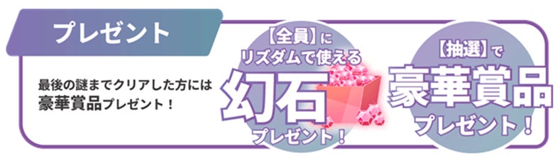 ゴールの謎を解き、クリアした方全員にリズダム内で使えるゲーム内通貨“幻石”、さらに抽選で豪華賞品をプレゼント。