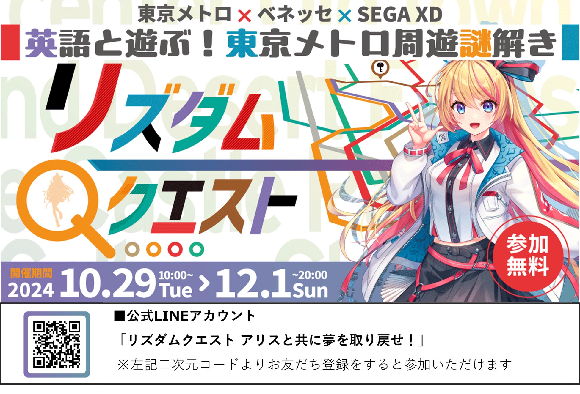 株式会社ベネッセコーポレーション(本社:岡山県岡山市、代表取締役社長:小林 仁、以下:ベネッセ)と株式会社セガ エックスディー(本社:東京都新宿区、代表取締役社長 執行役員 CEO:谷 英高、以下:セガXD)は、共同開発をしているゲーム型英語学習アプリ「Risdom(リズダム)」と東京地下鉄株式会社(本社:東京都台東区、代表取締役社長:山村 明義、以下「東京メトロ」)とのコラボーレーションで、「英語と遊ぶ! 東京メトロ周遊謎解き『リズダムクエスト アリスと共に夢を取り戻せ!』」を2024年10月29日(火)10:00 ~12月1日(日)20:00まで開催します。