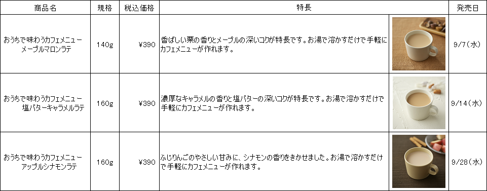 無印良品を展開する株式会社良品計画(東京都豊島区/代表取締役社長 堂前 宣夫)は、カフェのメニューをイメージした、寒い季節にぴったりの濃厚ドリンク“おうちで味わうカフェメニュー”3種類を9月7日(水)、9月14日(水)、9月28日(水)から、全国の無印良品で発売します。