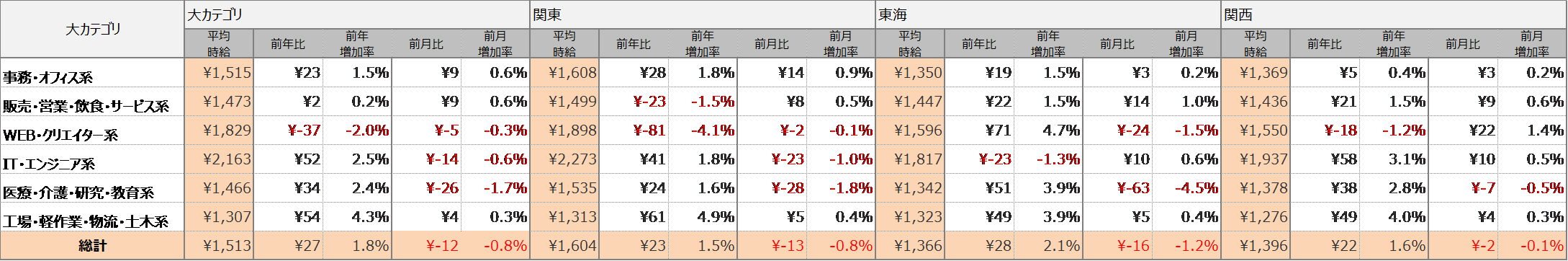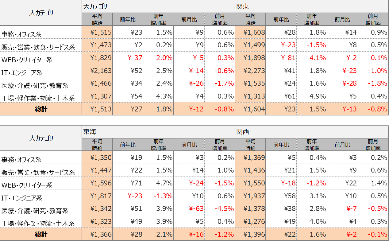 エリア別の平均時給は、全てのエリアで前年同月を上回り、関東エリアは1,604円(前年同月比+23円、前月比-13円)、東海エリアは1,366円(前年同月比+28円、前月比-16円)、関西エリアは1,396円(前年同月比+22円、前月比-2円)となりました。