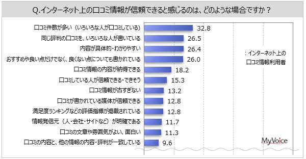 ■ネット上の口コミ情報利用者が信頼できると感じる場面は「口コミ件数が多い」が3割強、「同じ評判をいろいろな人が書いている」「内容が具体的・わかりやすい」「良い点だけでなく良くない点も書かれている」が各26%台