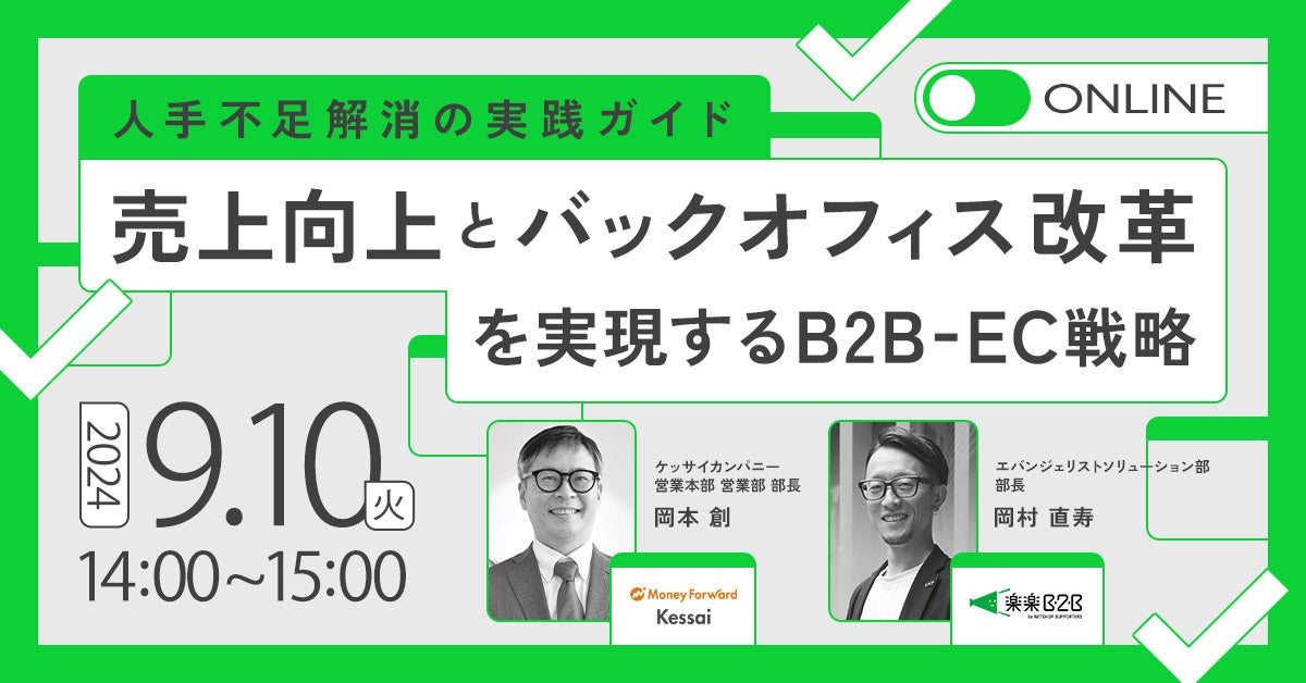 マネーフォワードケッサイ株式会社は、2024年9月10日(火)14:00より、企業向けweb受発注システム『楽楽B2B』を提供している株式会社ネットショップ支援室と合同で、無料オンラインセミナーを開催します。本セミナーではB2B-ECを導入して、バックオフィス業務を効率化することで、どのように人手不足問題の解消や、売上向上に繋がるかを解説します。