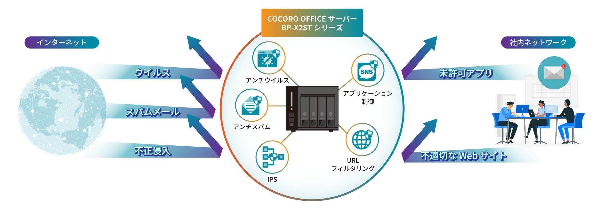 1.「COCORO OFFICEサーバー」に、「ファイアウォール」、「IPS」、「アンチウイルス」などのUTM機能をアドオンし、ネットワークセキュリティ対策機能を搭載