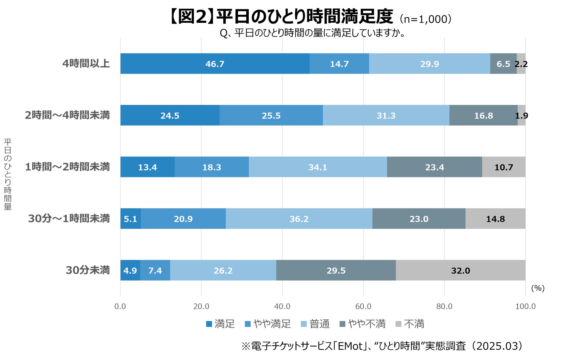 平日のひとり時間が30分未満で6割超が不満に感じる一方、2時間を超えると半数は満足となることから、2時間の確保が生活に満足を感じるか否かの基準と仮定できると考えます。この実態として、60.8%はこの基準を下回っていることが分かりました。