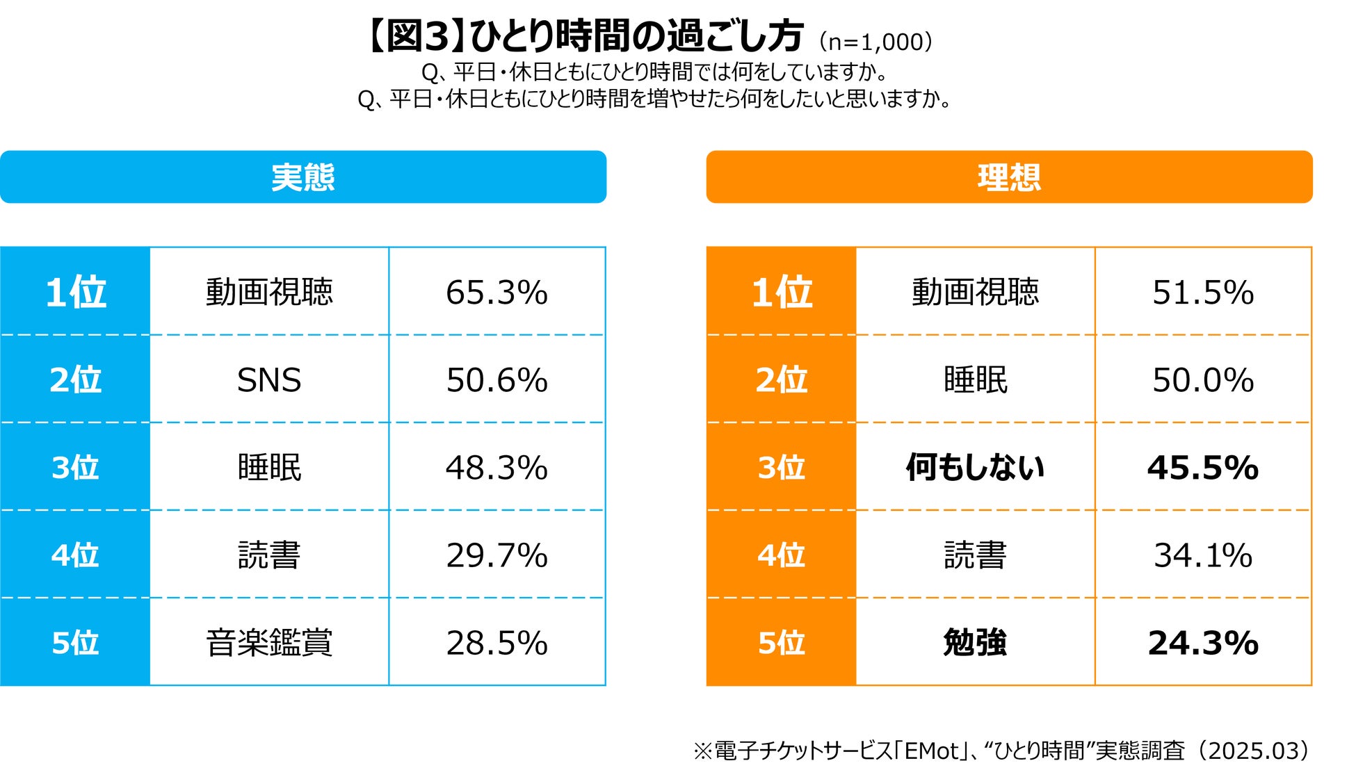 ひとり時間で実施したい理想事項は、「動画視聴」「睡眠」「何もしない(リラックス)」「読書」「勉強」と続きますが、実態は「動画視聴」「SNS」「睡眠」「読書」「音楽鑑賞」と続き、スマートフォンでできることが多くを占めました。比較すると、何もしないリラックス時間や、勉強時間を創出したい一方、これらは創出しにくいことが考えられます。
