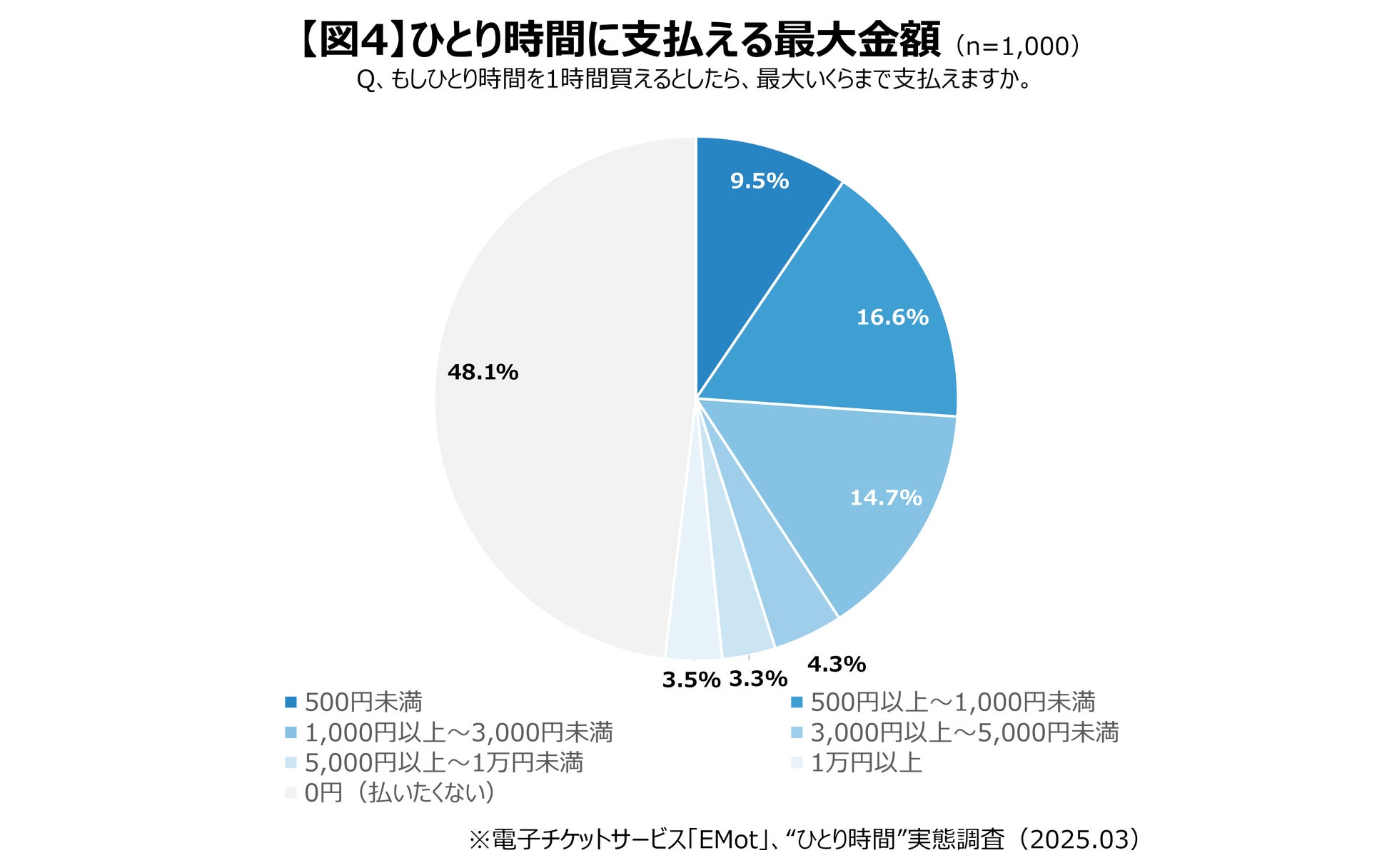 ひとり時間は、お金を支払ってでも手に入れたいと考える方が過半数、という結果もあります。1時間当たりに支払える金額として、千円程度であれば3割程度が支払うと回答し、1万円以上でも時間を買いたいとの回答は、3.5%になりました。