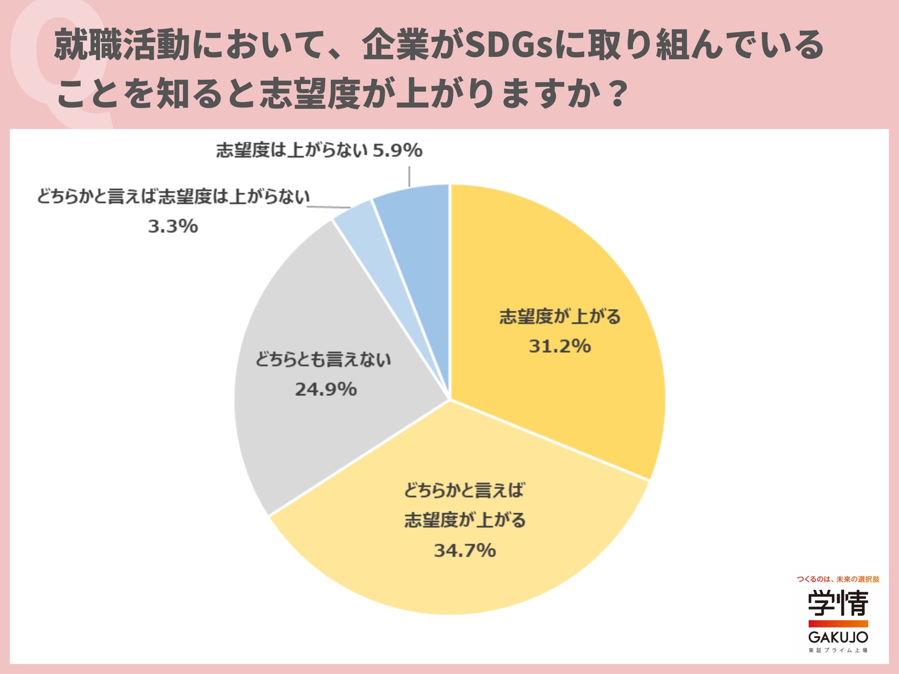 就職活動において、企業がSDGsに取り組んでいることを知ると「志望度が上がる」と回答した学生が31.2%に上りました。「どちらかと言えば志望度が上がる」と回答した学生34.7%を合わせると、7割に迫る学生が「企業がSDGsに取り組んでいることを知ると、志望度が上がる」としています。「SDGsに取り組む企業のほうが将来性を感じる」「自社の利益だけでなく、社会に関心を持つ企業は好感が持てる」「SDGsに取り組んでいる企業で働くことで、自分も社会に貢献しているという実感が得られそう」「その企業ならではの取り組みなど、内容が差別化できている企業は特に志望度が上がる」などの声が寄せられました。