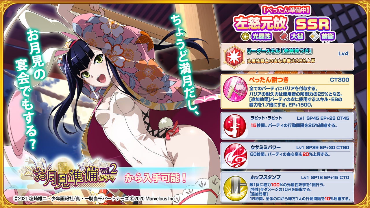 株式会社マーベラス(代表取締役社長 佐藤澄宣/所在地:東京都品川区)は、原作が20周年を迎えた大人気シリーズ「一騎当千」のAndroid/iOS向け新作ゲームアプリ『一騎当千エクストラバースト』で、2022年9月9日(金)からイベント「お月見♪バニーガールの宴」後半を開始したことをお知らせいたします。