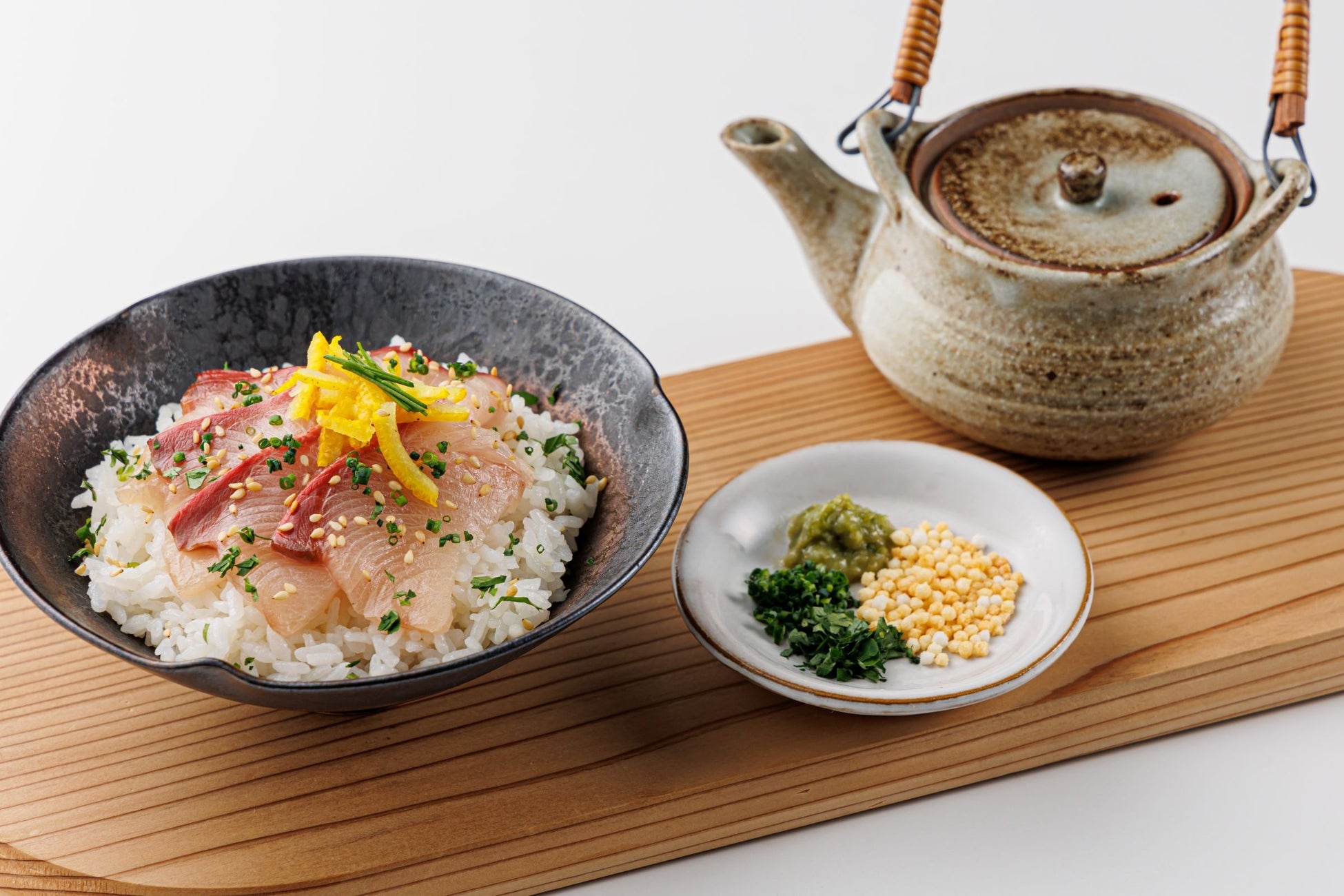 ブリと大根は相性も良く、寒い季節の脂が乗ったブリを合わせ醤油、柚子香る大根おろしと白だしで頂く風味豊かなお茶漬けに仕上げました。お食事の〆などに是非ご賞味ください。